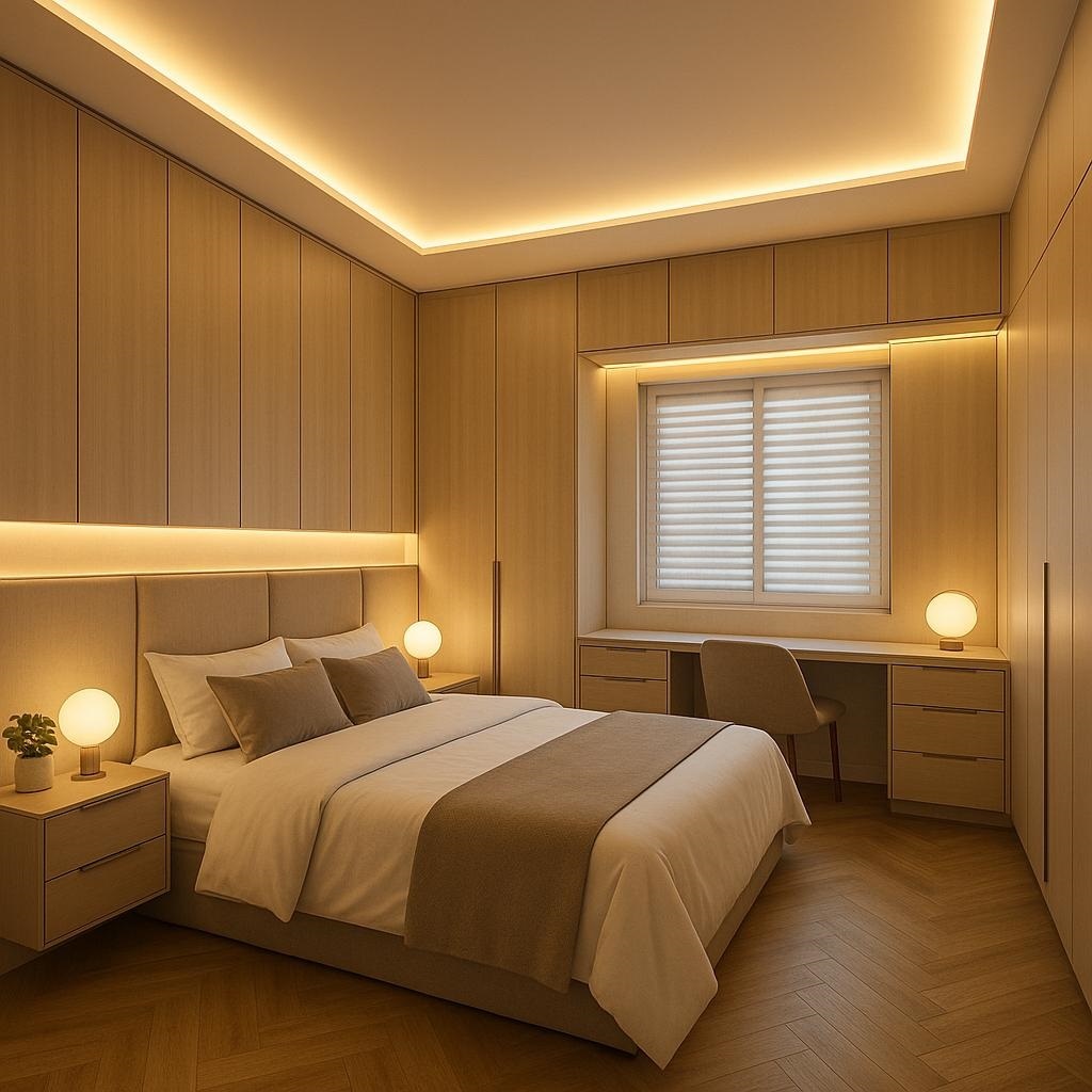Uma fusão minimalista, moderna e funcional com iluminação quente abundante, texturas suaves em cores neutras extremamente acolhedoras!
