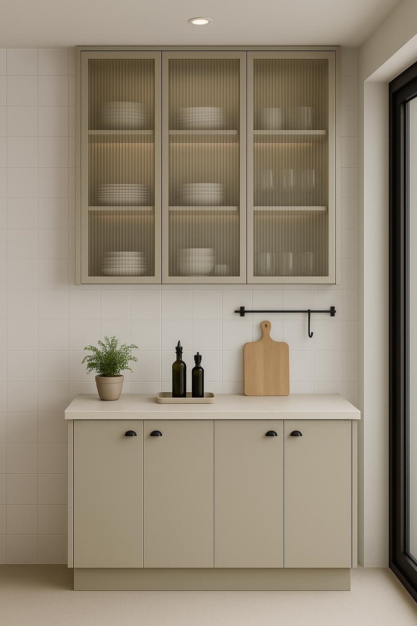 Um lugar de apoio, sofisticado usando vidro canelado, LED interno e puxadores concha, elevando design.